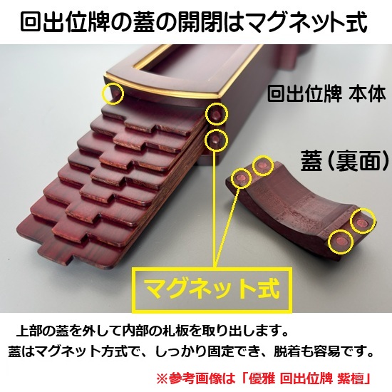 ◆回出(くりだし)位牌とは、お仏壇にご先祖様のお位牌が増えてきた場合に、一つにまとめることができる位牌です。内部に戒名を書き込める札板が数枚入っています。
